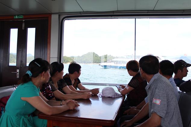 登上沁園07號游船,我們此次千島湖之旅算是正式開始了。泛舟于“天下第一秀水”,放眼望去,碧波無邊,群島競秀,真是“千島碧水畫中游”。大家正靜靜地陶醉在窗外的無邊美景當(dāng)中,忽然間旁邊游船上有人釣起來一尾一尺多長的大魚,讓我們興奮起來,也算見識了這里魚兒的肥美。