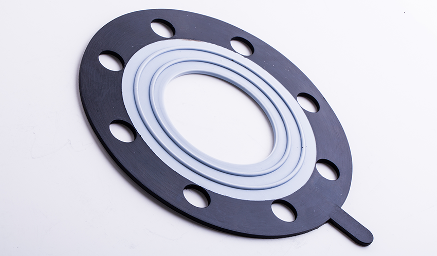 墊片以波齒形狀的同心圓溝槽為骨架,在這個(gè)基礎(chǔ)上包覆純聚四氟乙烯包衣,這種結(jié)構(gòu)即能保證整個(gè)墊片的整體強(qiáng)度時(shí),又有一定的壓縮、回彈性能,而且聚四氟乙烯包衣結(jié)構(gòu)能解決墊片的潔凈問題。