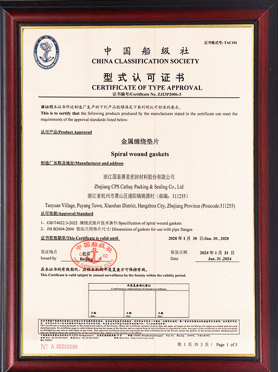 中國船級社金屬纏繞墊片型式認可證書