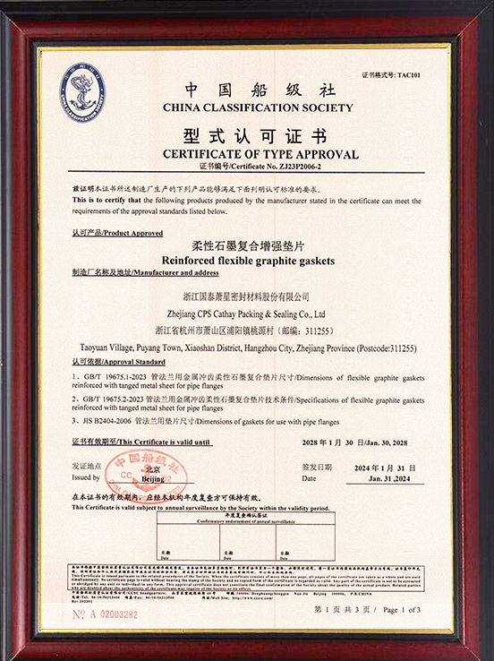 中國船級社石墨增強墊片型式認可證書
