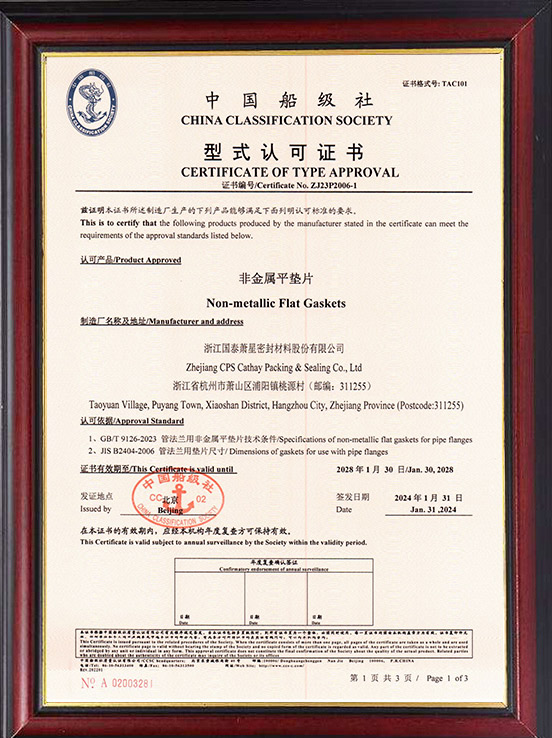中國船級社非金屬平墊片型式認可證書